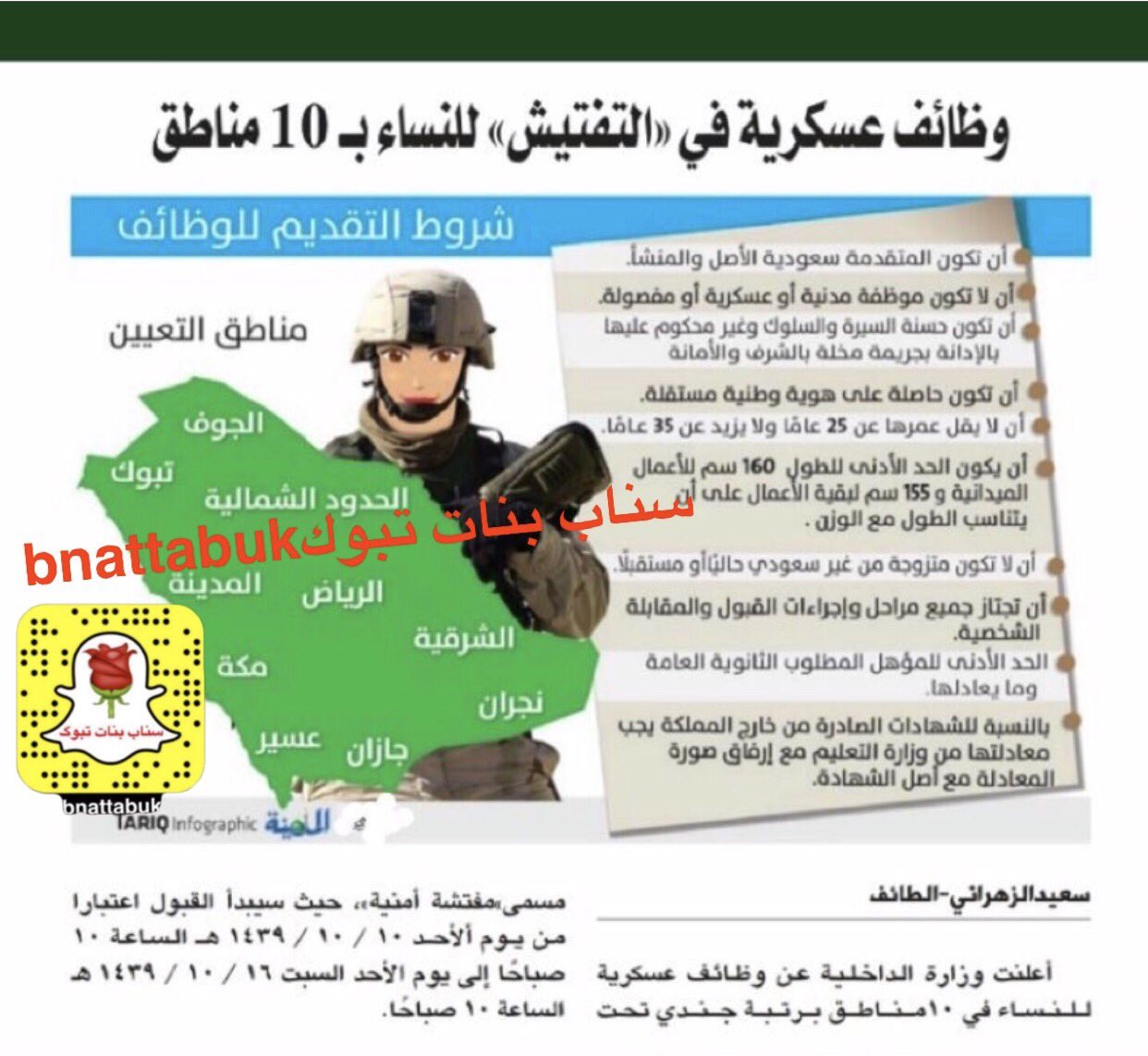 سناب بنات تبوك على تويتر وظائف عسكريه للنساء في 10 مناطق برتبة جندي تحت مسمى مفتشة أمنية تشمل منطقة تبوك حيث سيبداء القبول أعتبار من تاريخ 1439 10 10 الساعة 10 صباحا سناب بنات تبوك