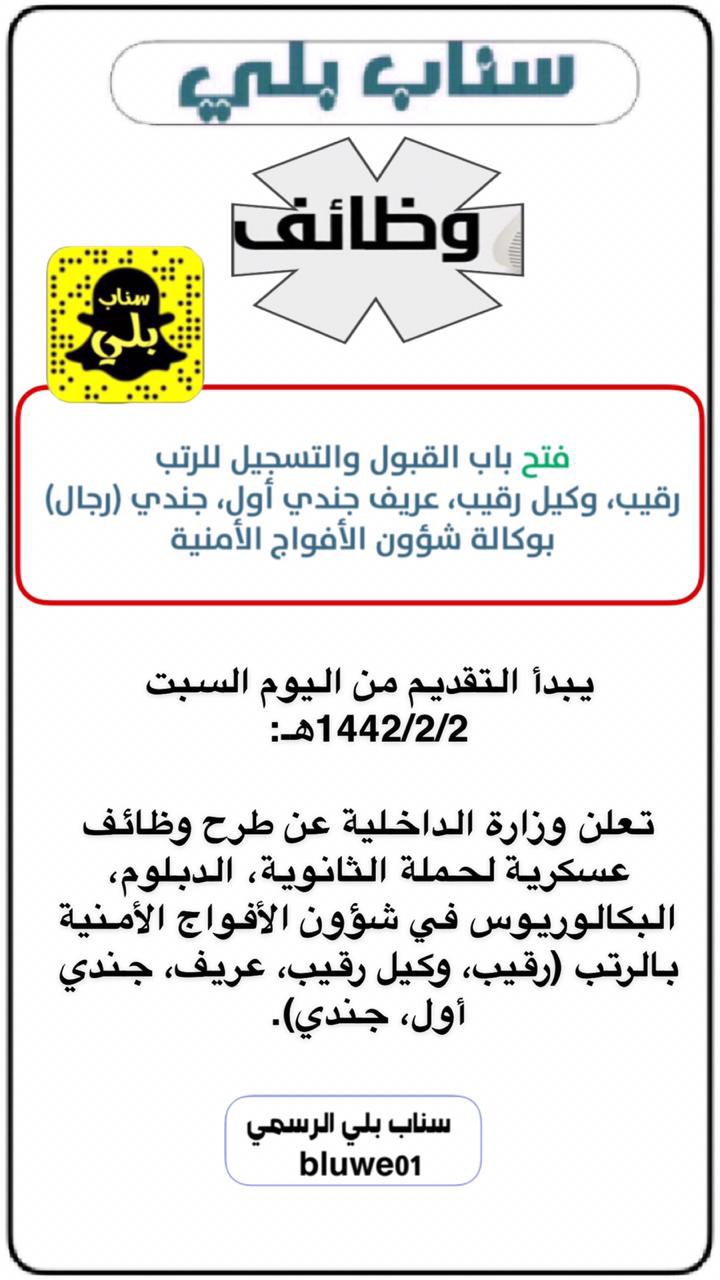 سناب بلي الرسمي V Twitter يبدأ التقديم من اليوم السبت 1442 2 2هـ تعلن وزارة الداخلية عن طرح وظائف عسكرية لحملة الثانوية الدبلوم البكالوريوس في شؤون الأفواج الأمنية بالرتب رقيب وكيل رقيب عريف جندي أول